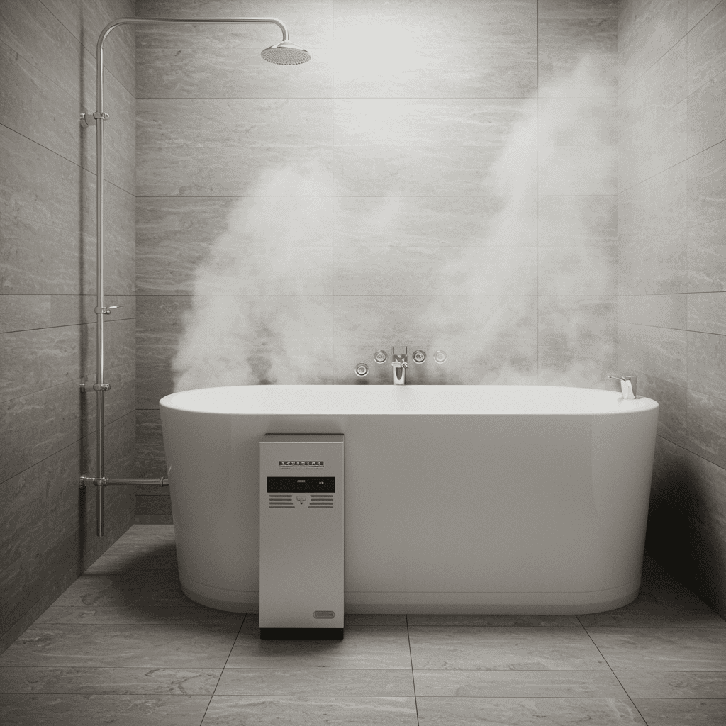 A steam generator is a sealed, electrically powered unit connected to your water supply. It heats water to boiling point, converts it to steam, and delivers that steam through a steam head mounted inside your steam room. The generator is typically installed outside the steam room itself — inside a wall cavity, under a vanity, inside a cupboard, or in an adjacent utility space — and connected to the steam head via an insulated pipe.